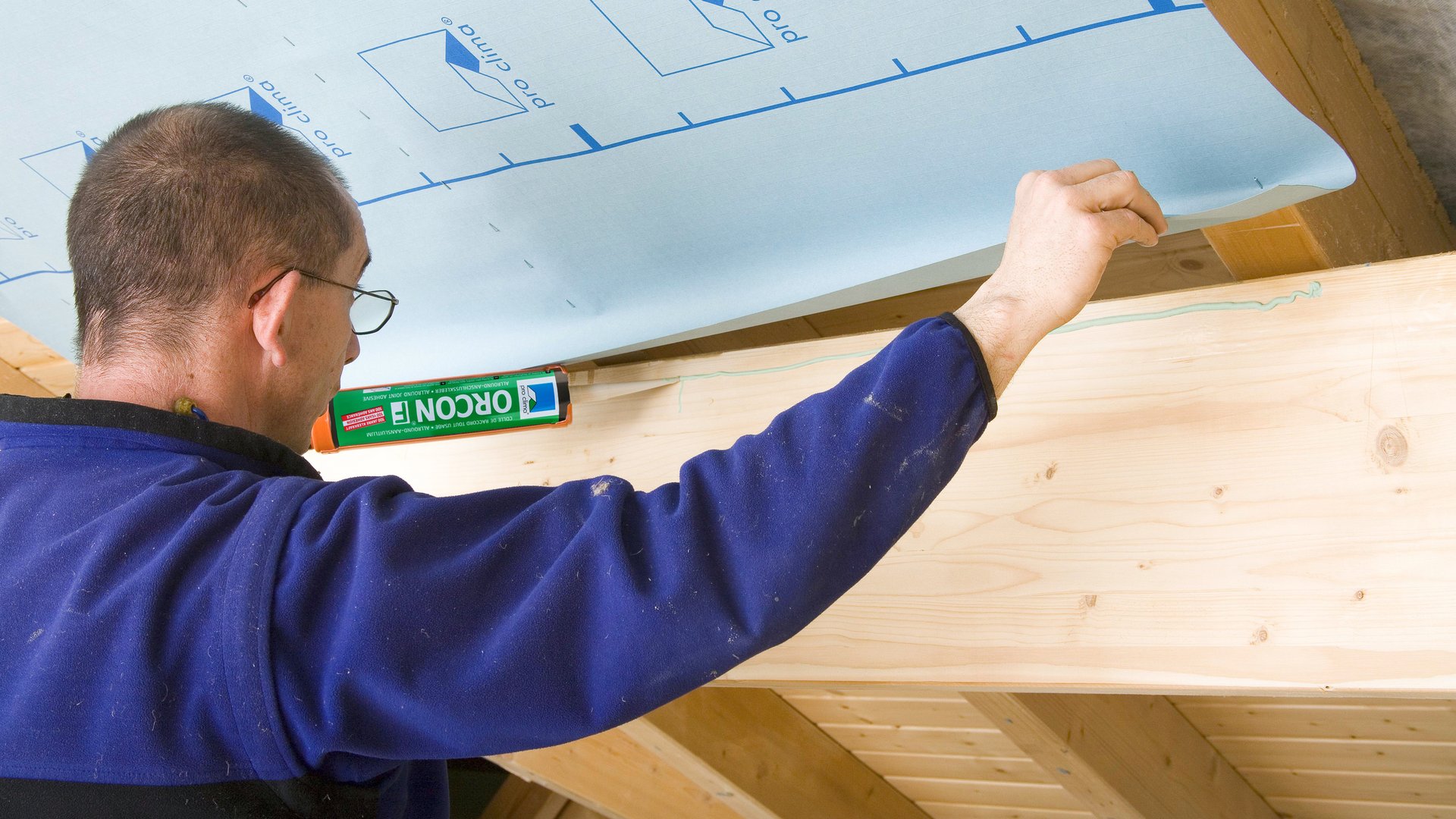Amener le frein-vapeur en place, détacher le papier transfert du ruban CONTEGA PV et coller le frein-vapeur sur le ruban, avec une boucle de dilatation.